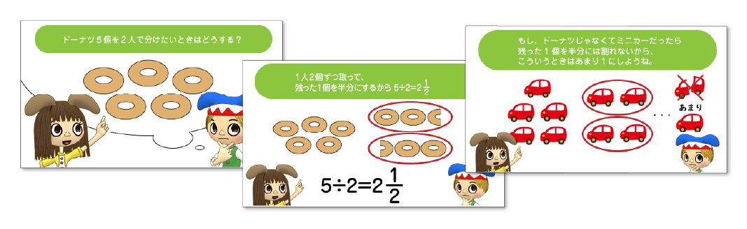 形式的に習う計算にも意味があります。例えば、小学校の算数で登場する「あまり」の概念。「数の極®」で算数を学んだお子さんは、このように「あまり」をイメージできます。