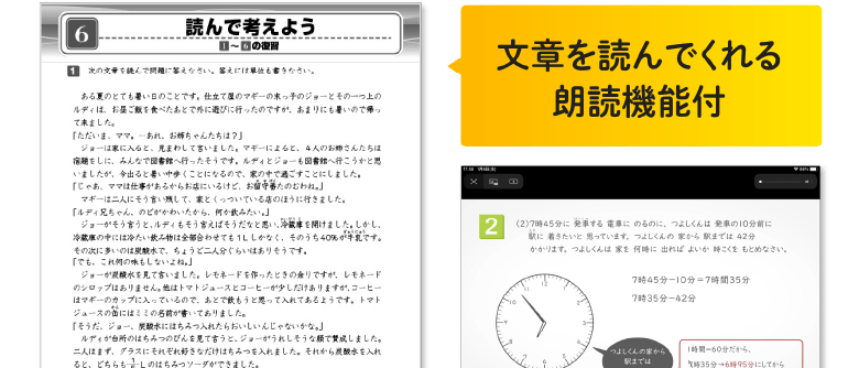 算数の長文問題も出題されます。ただ数字を拾って計算する癖をつけることなく、意味を考えて答える訓練をします。また、文章を読んでくれる「朗読機能」があるから文章に慣れていなくても安心して取り組むことができます。